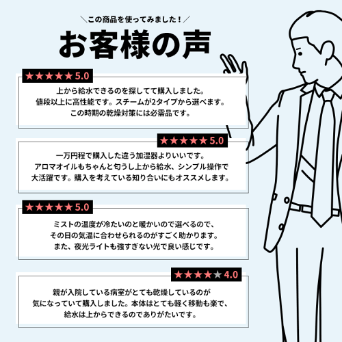 ●超音波振動+ヒーターのハイブリッド加湿で効率的に潤す! ●環境に合わせてお好きな加湿量に調整できる ●一回の給水で約17時間加湿ができ、朝から夜まで潤いが続く! ●フタを外して上から給水できるので給水がとってもラク! ●透明タンクで水の残量がひと目でわかる! ●アロマトレイ付きで香りも楽しめる! ※ご使用になるアロマオイルの注意事項をよくお読みください 水タンク容量 約6L(6リットル) カラー ホワイト(白) 定格電圧 AC100 定格消費電力 110W 定格周波数 50/60Hz 噴霧量 最大約360ml/h サイズ 約252×215×286mm 重量 約1700g ケーブル長 約1400mm 動作時間 最大噴霧時約17時間 付属品 クリーニングブラシ 保証期間 お買い上げから6ヵ月間保証 商品の特徴 加湿器 スチーム 大容量 6リットル ハイブリッド加湿器 アロマ加湿器 上部給水 上から 給水 上部注水 上から注水 お手入れ簡単 LED ライト ハイブリッド式 超音波式 ハイブリット加湿器 シンプル 加湿 器 お 手入れ 簡単 衛生的 静音 静か プレゼント ギフト 贈り物 アロマ 香り アロマウォーター 除菌液 除菌剤 除菌 透明タンク ミスト クールミスト ウォームミスト 超音波 ヒーター 加熱 抗菌効果 子供 子ども 赤ちゃん リビング 寝室 オフィス 業務用 卓上 コンセント シンプル 白 ホワイト おしゃれ 人気 おすすめ ダイニ ライフスタイル 上