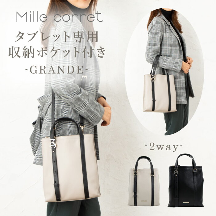 【新作】バッグ レディース ショルダーバッグ A4サイズ トートバッグ TOTE 本革 レザー 革 牛革 ブランド タブレット 端末 保護 ポケット pc ペン差し 会社 仕事 通勤 テレワーク 斜めがけ 大人【Mille corret GRANDE】