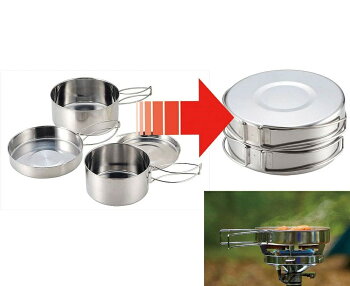 登山やキャンプに最適の折りたたみハンドルの付いたコンパクトサイズのステンレス製5点食器クッカーセットです。