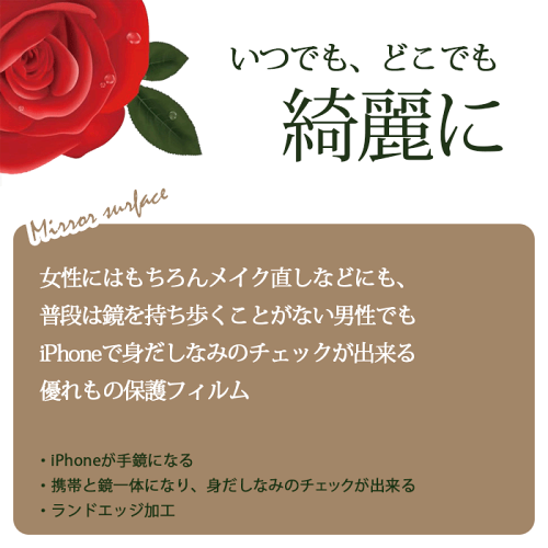 女性にはもちろんメイク直しなどにも、普段は鏡を持ち歩くことがない男性でもiPhoneで身だしなみのチェックが出来る優れもの保護フィルムなので、液晶画面をキズやホコリ、指紋汚れなどからしっかり保護します。